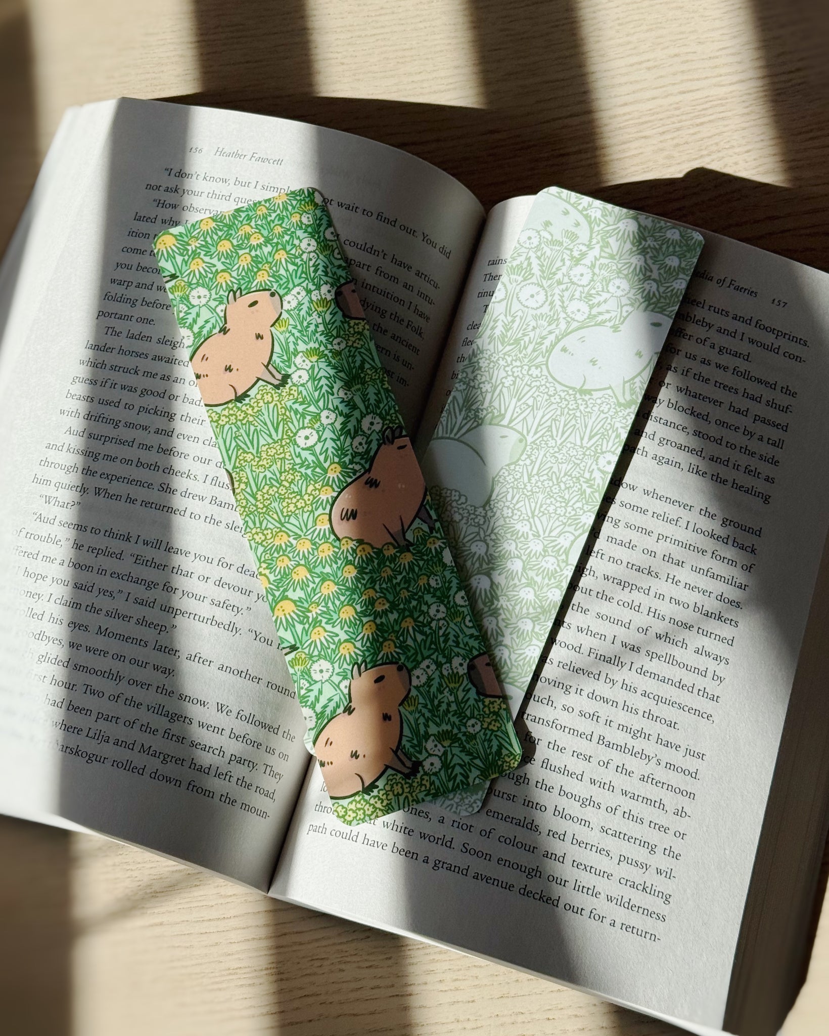 This durable capybara bookmark is laminated, illustrated, and handmade by me. It is sturdy and rigid, and can also be used as a small washi tape cutter or a washi tape sample card.