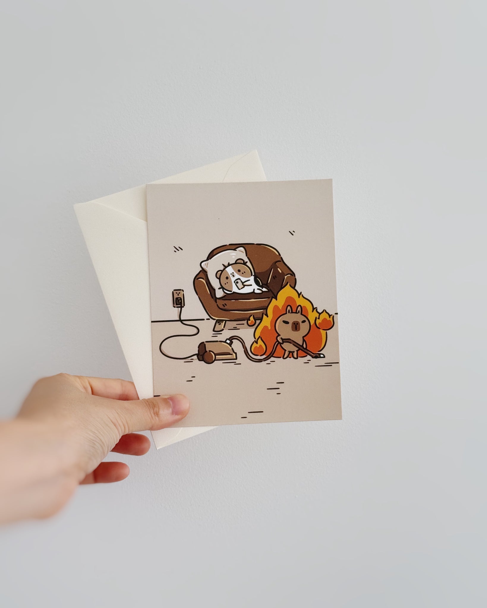 This cozy mini print / A2 flat card features Bubu the Guinea Pig lounging on the sofa, scrolling on their phone, while Moonch the Capybara is hard at work vacuuming (and clearly on fire). It’s the perfect piece to add a little humor and coziness to any space or to gift your roommate who never cleans as a gentle reminder, lol.