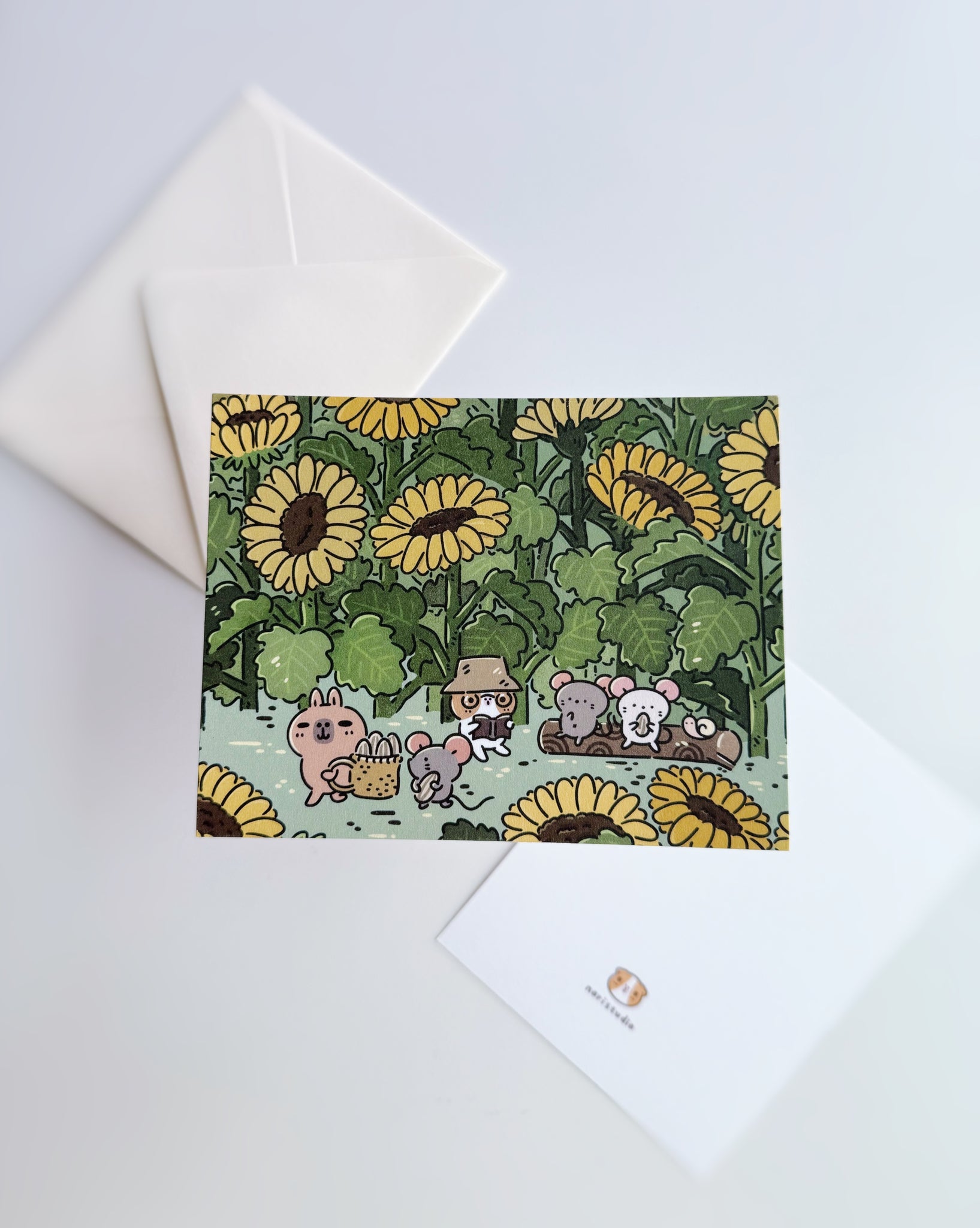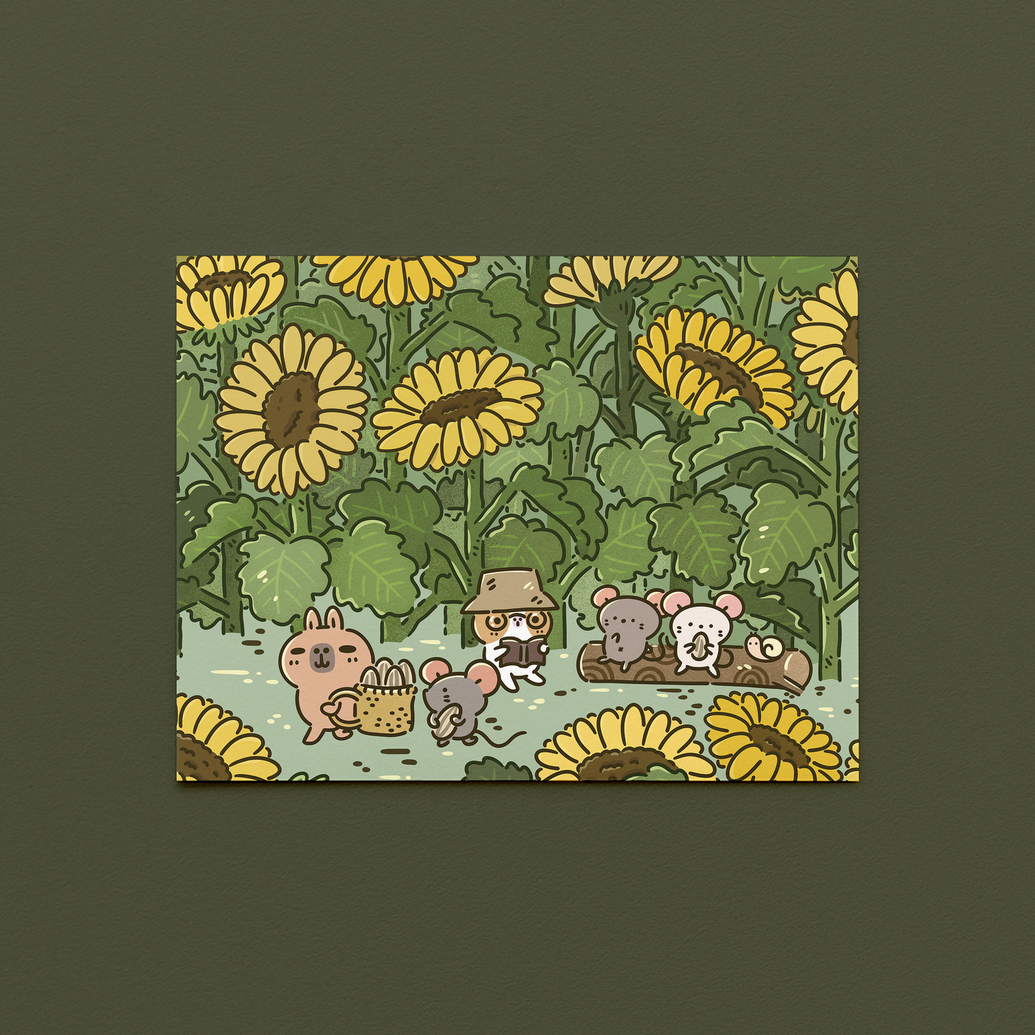 This cozy mini print / a2 flat card shows Bubu the Guinea Pig and Moonch the Capybara babysitting three cute little mice in a cheerful sunflower field. It’s the perfect touch for a cozy